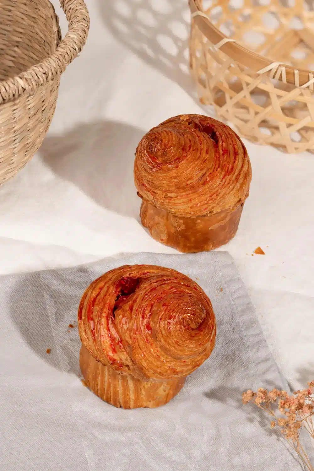 Le cruffin est un délicieux croisement entre un croissant et un muffin, avec une texture feuilletée, beurrée et légèrement croustillante à l’extérieur, tandis que l’intérieur est tendre et moelleux et garni d’une confiture framboise maison.